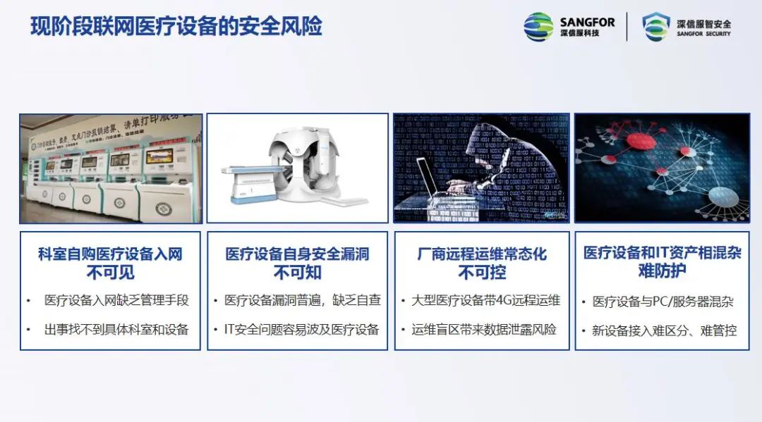 缺乏统一管理手段、设备自身存在安全漏洞、经常需要厂商远程运维、医疗设备和IT资产混杂等情况,导致医疗设备存在严峻风险挑战。