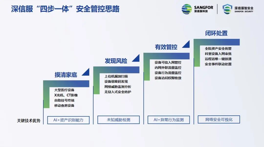 张振礼提到,深信服基于AI等智能技术打造的医疗设备安全解决方案,能够从“摸清家底”、“发现风险”、“有效管控”、“闭环处置”四个方面共同着手,为医疗设备安全提供持续保护。