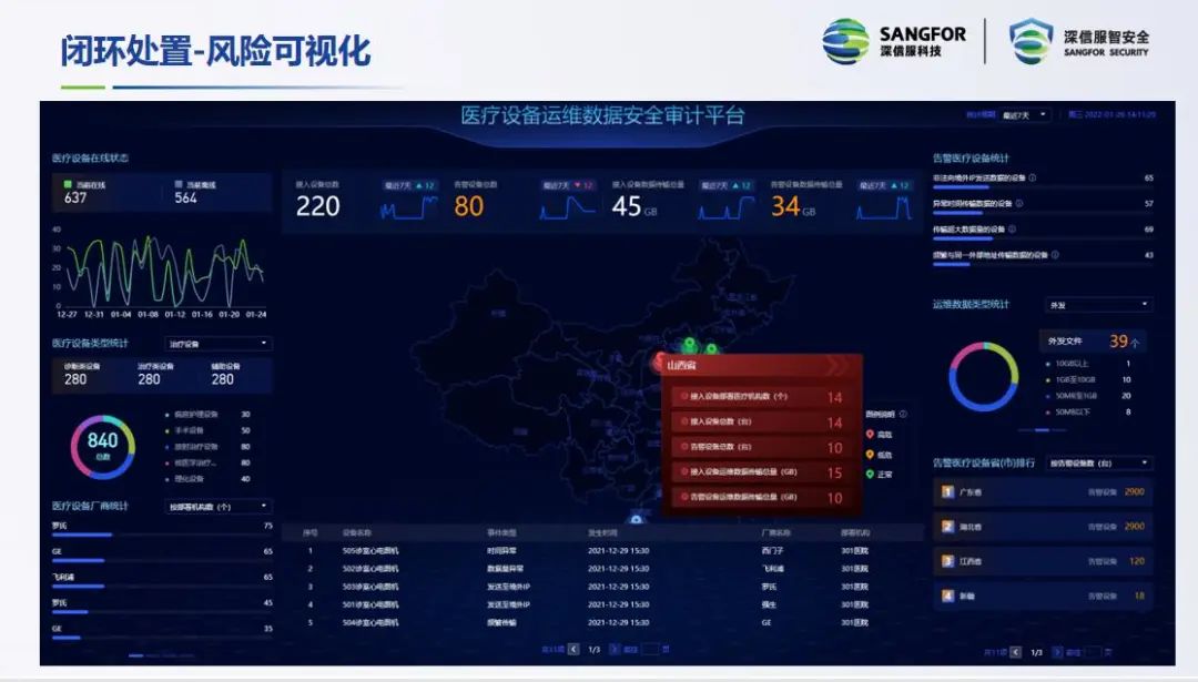 闭环处置:通过深信服物联网安全管理平台SIMP,结合SIG获取的流量信息,用户可以快速发现数据泄露等安全问题,并进行精准定位,下发处置指令,阻断数据外发IP,完成从发现、分析到处置的闭环处置,并将整体的医疗设备网络安全态势进行可视化呈现。