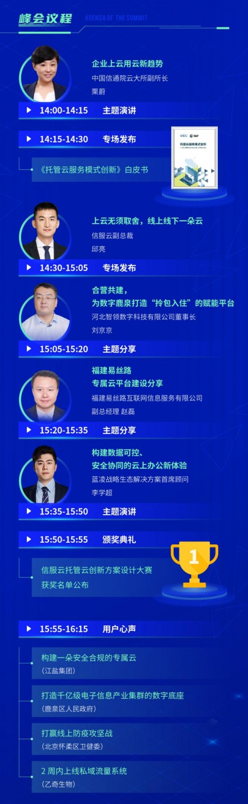 在本次大会上,观众不仅可以从宏观角度了解企业上云用云的最新趋势,掌握新经济下产业业态发生的变化、企业云资源效益提升的举措。还可以了解河北石家庄市鹿泉区人民政府、北京市怀柔区卫健委、江盐集团和乙奇生物如何进行数字化转型的成功实践。