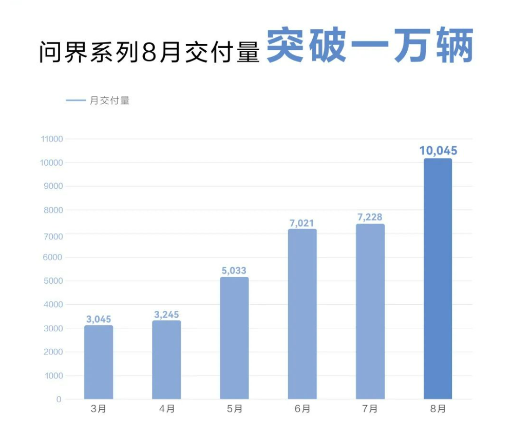 目前,问界M5、M7凭借过硬的产品素质,均实现了上市即热销。其中,问界M7更是实现了上市后51天启动全面交付的最速纪录,以多重实力满足用户需求,回应热切市场呼声。据了解,问界M5 EV也将很快启动交付,预计也将创造不俗的市场表现,有望刷新两款前作的月销纪录。8月,问界系列交付量达到10,045辆,首次实现单月交付量破万。在缺芯、疫情、高温、限电等诸多因素的影响下,不仅实现了逆势增长,也创造了国内新能源汽车品牌单月交付破万最快的纪录。