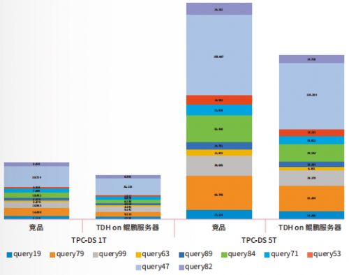 TPC-DS测试 Inceptor TDH on鲲鹏服务器在1TB时性能较竞品提升约28%,在5TB时性能较竞品分别提升约38%