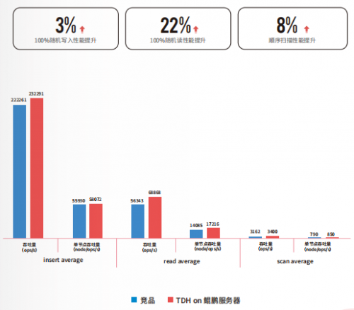 YCSB测试 Hypebase TDH on鲲鹏服务器在100%随机写入性能较竞品提升约3%,100%随机读性能较竞品提升约22%,顺序扫描性能较竟品提升约8%