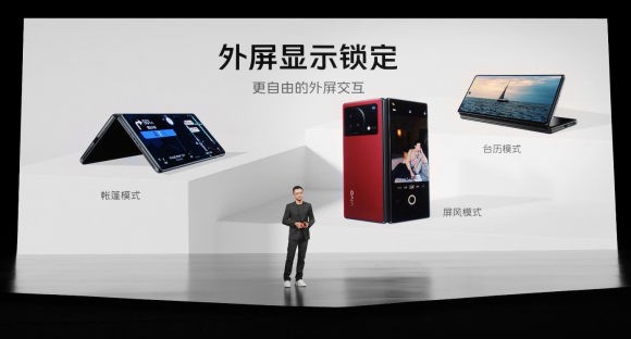 依托于悬停功能,vivo X Fold+可以实现一系列独特的交互体验。在WPS软件上,vivo X Fold+支持演讲者模式,悬停状态下的X Fold+上面是PPT、下面是备注,并且可以通过WiFi直接投屏,使用感受无限趋近与笔记本电脑。悬停通话、悬停观影等功能更是可以帮助用户解放双手;另外,vivo X Fold+的外屏显示锁定支持帐篷模式、屏风模式和台历模式,为用户带来一用难回的使用体验。