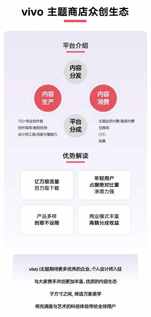 vivo i主题作为vivo移动端核心系统应用之一,旨在通过提供优质的系统界面视觉美化服务,为消费者带来更个性更友好的美学体验。在用户层面,vivo i主题拥有良好的动线设计和优质内容。vivo i主题基于对用户偏好内容的洞察反推创作基础及引擎能力提升,再通过更科学合理的产品框架,强大的算法及运营分发推荐给合适的用户。在为用户考虑的同时,vivo也致力于为开发者和主题创作者构建通畅的快车道,在引擎工具赋能、设计赋能以及流量赋能三个方面进行升级。为了给创作者提供更完善更友好的创作环境,vivo通过构建以底层引擎及关键交互技术为基础的前端生态,以设计师平台和商业化广告平台为基础的后端服务,打造更良性的B端生态;此外,以优质创作推荐、优质内容指导的分层推荐体系,也将全方位为创作者的成长保驾护航。
