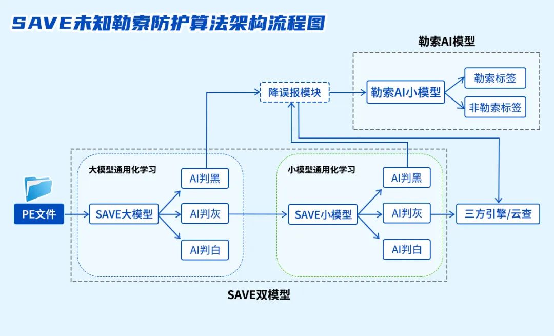 勒索病毒由于攻击门槛逐渐降低、攻击入口增加导致勒索病毒变种发展迅猛,这非常考验终端防护产品对未知威胁的检测能力。深信服EDR在新版本对SAVE引擎进行全新升级,引入“大模型+小模型”的双模型架构增加AI泛化能力,对可疑文件进行双重AI检测,提升对未知威胁的检测能力,同时通过勒索AI模型再次对判黑的威胁文件确认是否为勒索病毒。