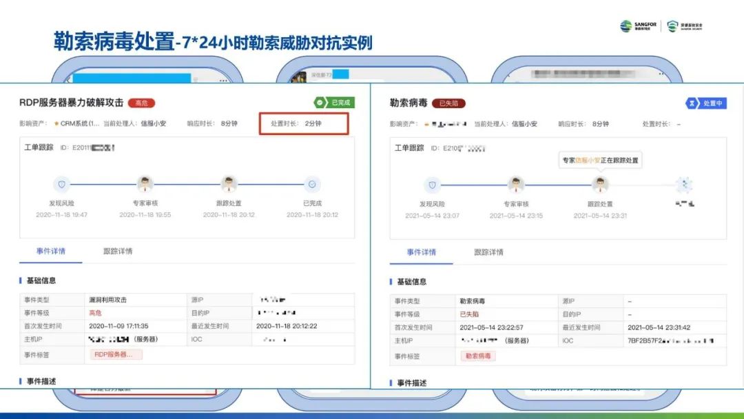 深信服EDR拥有7*24小时监测预警体系,在智能识别勒索高准确的基础上联动多个安全设备进行及时处置,并实时微信推送勒索告警,协助用户第一时间对勒索攻击进行取证,实现反制溯源,大大降低被再次攻击甚至攻破的可能性,三步高效治理勒索风险!