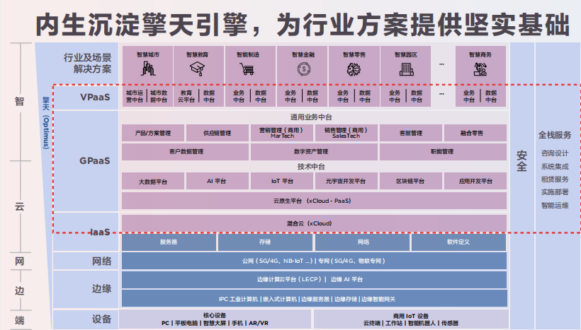 在新IT驱动下的智能化转型新阶段,核心的、底层的基础技术创新可以极大地降本增效,对全社会数字化转型产生革命性的改变。此前,联想将自身38年数字化实践,梳理和提炼出名为“擎天”的智能化引擎,成为其向各行业客户提供解决方案的核心中台。“擎天”引擎基于联想提出的“端-边-云-网-智”的新IT架构,具备中台化、云原生、AI广泛嵌入三大特征。在GPaaS通用中台,“擎天”通过大数据、AI、元宇宙等技术平台提供上层应用开发所需要的智能化技术支撑,在GPaaS通用业务中台,“擎天”提供企业运营管理通用的业务组件。GPaaS之上是为不同行业的应用解决方案所搭建的 VPaaS行业中台,目前涵盖了智慧城市、智慧教育、智能制造、智慧园区、智慧零售和智慧商务等行业客户方案。
