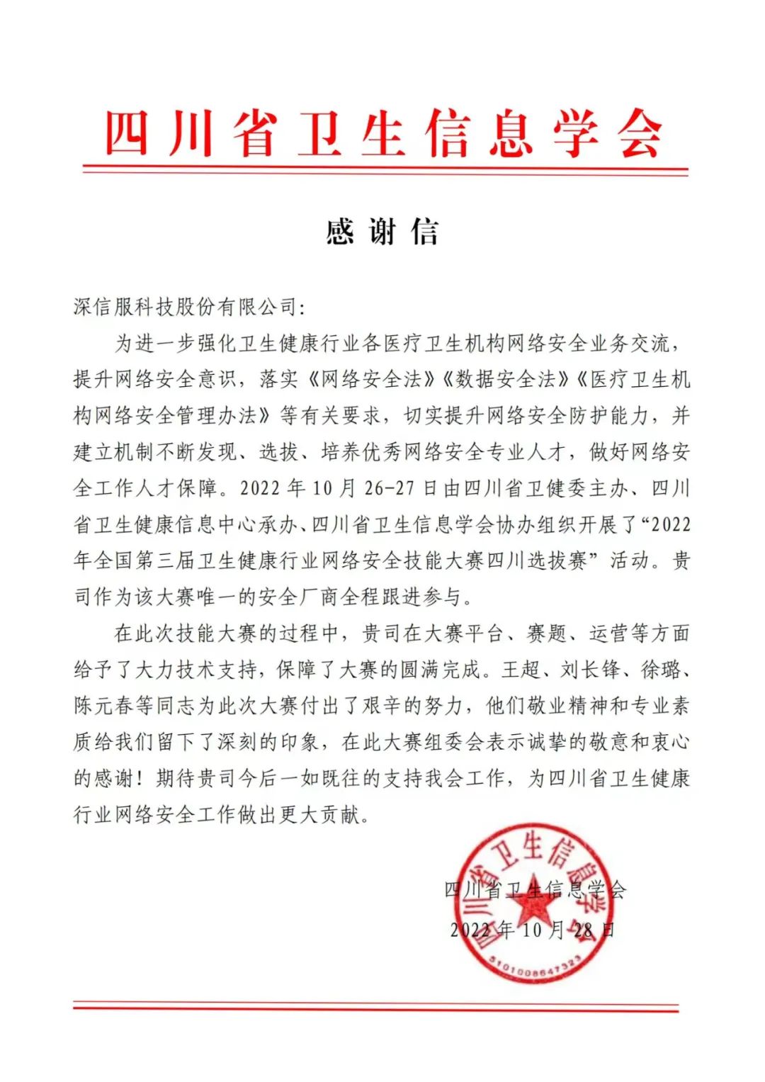 大赛旨在加强对医疗卫生行业网络安全人才培养和安全意识工作,推进常态化网络安全教育工作开展,落实网络安全主体责任,加大网络安全人才培养力度。对于深信服在整个比赛过程中表现出专业的团队精神和技术实力,包括四川、山东等多省卫健委及相关主办方对深信服以感谢信的形式表示了充分认可。