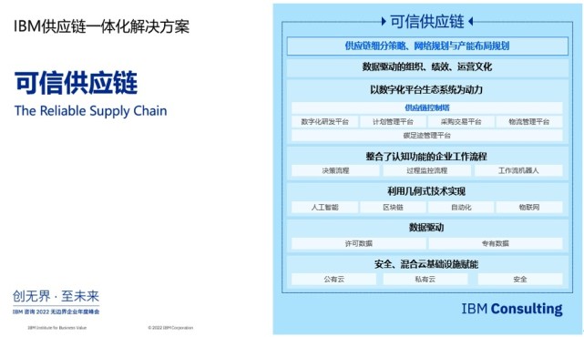 在IBM咨询2022无边界企业年度峰会供应链智慧转型圆桌中,IBM咨询提出了“可信(Reliable)供应链”解决方案。可信供应链解决方案是从战略到基础设施的一体化解决方案,其中既包含上层的商业模式思考,供应链细分策略、网络和产能布局的整体规划,也包括组织、绩效、运营文化的打造等,涵盖研发、计划、采购、物流等各环节的供应链控制塔的构建,也涵盖混合云等底层基础设施的搭建,人工智能、区块链、自动化、物联网等新技术的运用,以及端到端智能工作流的打造。