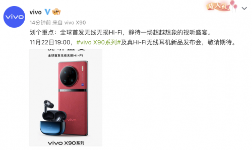 十年来,vivo一直不曾间断对高品质音乐效果的追求与探索,使其在Hi-Fi音乐方面的又一次突破。为广大用户带来了真无线,真Hi-Fi的体验,X90系列也将以此打造成巅峰之上的真机皇,也为11月22日的发布会增添了更多期待。