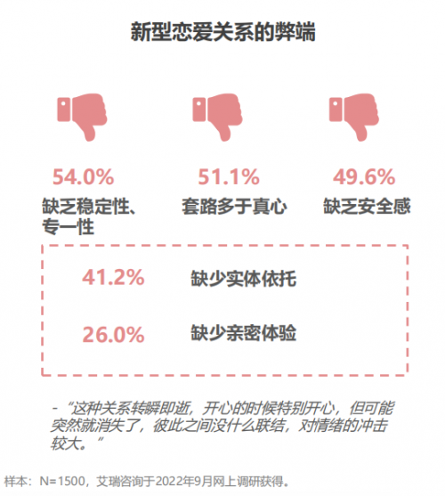 据《白皮书》显示,随着年轻人对有精神愉悦感、新鲜感,以及有独立个人空间的恋爱的追求,想体验新型恋爱关系的人越来越多。他们不会预设形式,而是专注于人和感觉,让恋爱关系自然发生。区别于传统的一对一、长期、稳定,“以结婚为目的”的所谓“新型恋爱关系”开始被越来越多的年轻人群接受。这种恋爱关系,包括但不限于线上情侣、虚拟恋人、AA制恋爱、快餐式恋爱和开放式关系等。但在选择新型恋爱的同时,他们也对关系的不稳定性等隐患有所担忧。