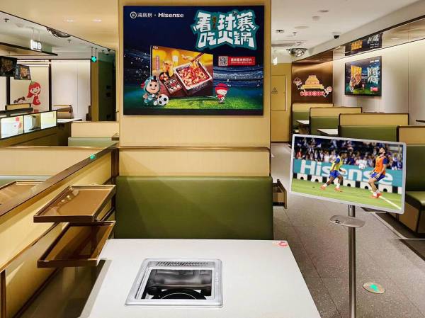 在店内,海信与海底捞将联合打造3家世界杯主题店(海底捞北京青年路店、海底捞上海览海国际店、海底捞深圳南山茂业店),每家主题店设置5-10个海信电视移动观赛席,配备海信电视移动观赛神器——海信健身智慧屏X7H。每晚夜宵时段(22:00-次日早7:00),球迷捞粉到店说出暗号“看球赛,吃火锅”,就有机会到观赛席就餐,吃着热气腾腾的火锅,C位看球,零距离感受热辣美食与激情赛场。