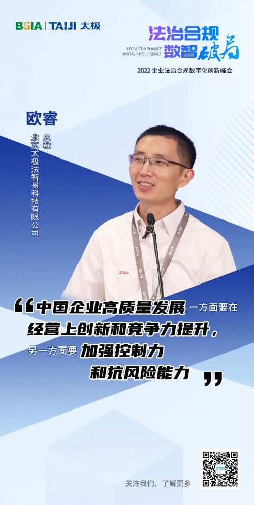 现在都在谈高质量发展,那么什么叫高质量呢?从企业管理的微笑曲线来看,很多中国企业都在微笑曲线的底部,附加值较低的部分。现代化的企业越来越多投入核心技术,例如华为做芯片的研发投入,中国信创环境下基础软件的研发,这是企业的转型。另外随着中国的经济环境和竞争格局的变化,我们要非常重视风控和合规的环境,这和中国企业的发展是非常紧密的。如果没有风险、内控和合规上的治理,企业是很难平稳发展的,我们说的高质量发展要解决企业发展过程中,经营和风控上的平衡和统一。这是我们希望未来太极法智易主要研究的方向。