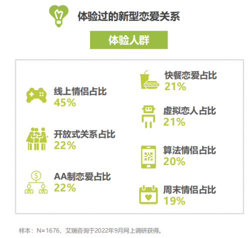 细读报告我们发现:年轻人群中体验过新型恋爱关系的人达到73%,其中线上情侣占比45%,AA制恋爱和开放式关系分别占比22%,成为新型恋爱关系的TOP3;而从未尝试过但想要尝试新型恋爱关系的意向人群比例为12%,虚拟恋人、周末情侣、开放式关系占据这类意向人群最想尝试的恋爱关系前4位。