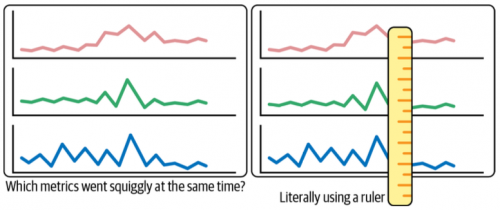 在“新式”仪表板中,标尺变成了一条基线,使不同的指标之间产生基于时间维度的关联性,但这同样是一个粗略的解决方案,识别相关性仍然需要靠运维人员的经验判断。在对故障问题有了粗略猜测后,运维人员需要查看可能与问题相关的事务(日志)和资源(机器,进程,配置文件)。