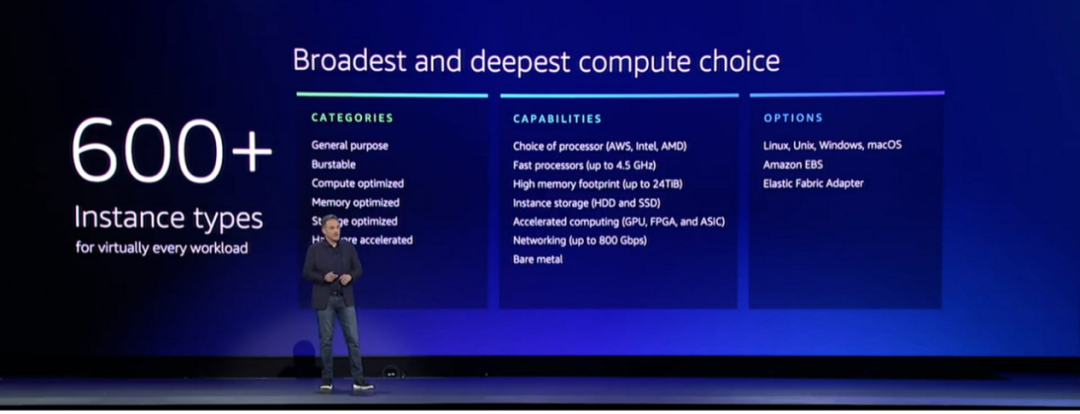 在极端的环境里面,足够好,有时候还是不足够好,所以我们准备好克服各种各样的困难,我们在亚马逊云科技应对的是各种极端的环境。比如,F1 赛车有5亿个不同的数据点需要得到监控,从60到12个小时的减少时间,Epic Game 需要支持上亿个不同的玩家,所以他们有很多的要求,他们需要处理成亿的不同的要求,我们也可以给他们提供非常小的延迟。Nielsen 每天有数十亿的数据需要处理。所以亚马逊云科技一直在创新,长期为客户提供所有数据分析的可用工具。亚马逊云科技现在有600多种实例类型来满足几乎任何类型的需求或使用案例,其中许多实例使用的是特别定制的芯片。