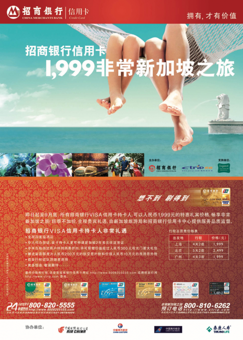 譬如和国航一起推出了具有里程积分功能的“国航知音信用卡”;和携程一起,借势新加坡开放自由行之际,打造了旅游双币卡,推出的“非常新加坡”活动创出单地旅游最低价。这些联名创新理念,切实地连接了商业实体和消费者们,为双方带去真正的实惠。