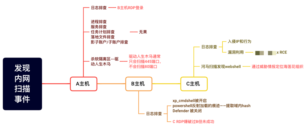 安全团队立即通过远程方式接入某省地震局内网,排查告警信息中提到的A主机:首先分析日志,发现B主机通过RDP登录;但A主机的进程、服务、任务计划、落地文件等均无异常,只是在杀软隔离区发现了驱动人生木马,但此木马只会扫描445端口,并不会扫描80端口。