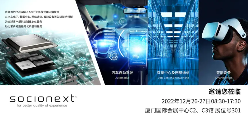 Socionext Inc.是一家全球领先的SoC(System-on-Chip)供应商。凭借多年来积累的技术经验,Socionext开创了独有的“Solution SoC”业务模式,在汽车电子、数据中心、网络通信、智能设备等先进技术领域提供创新思路。作为一个值得信赖的合作伙伴,Socionext能为客户产品提供更为卓越的规格、性能和质量,以差异化提升产品核心竞争力。