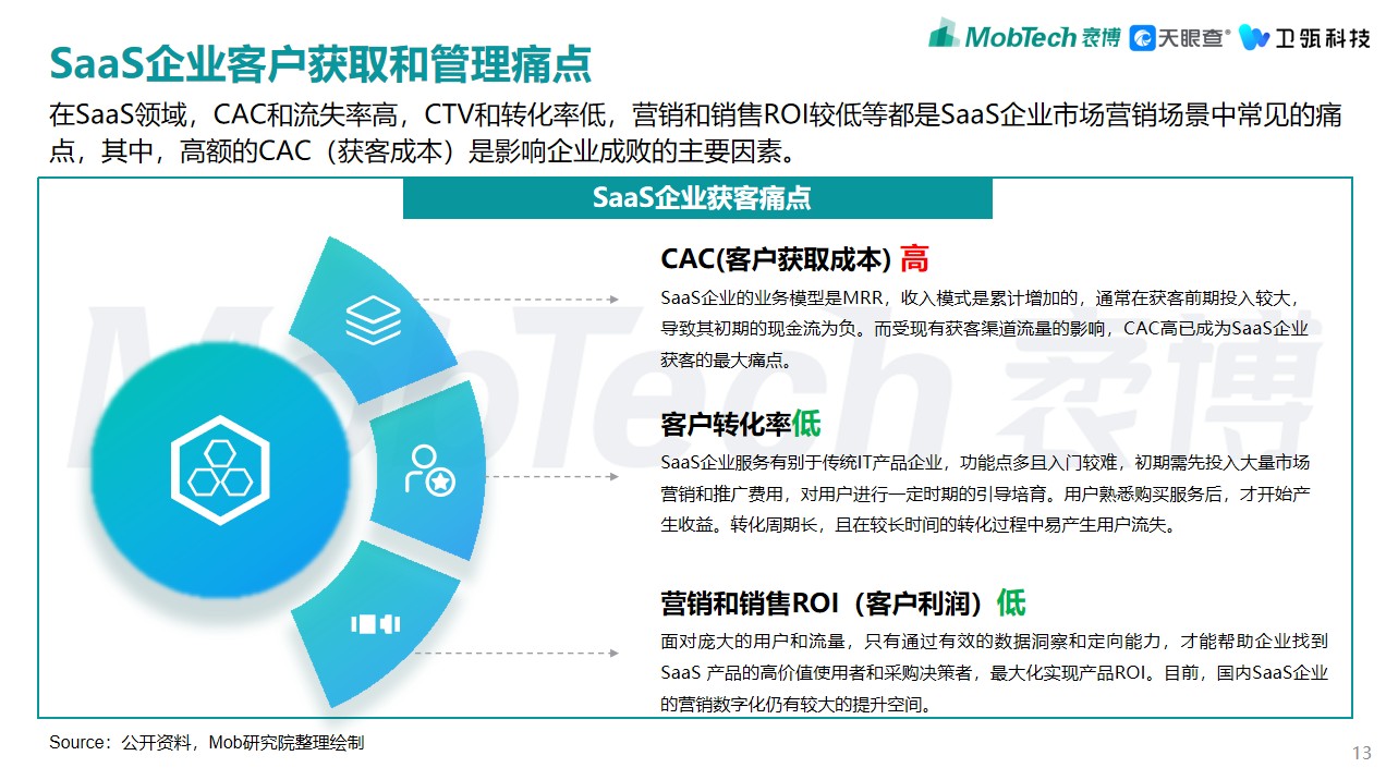 特殊状况后时代,SaaS服务市场崛起。天眼查数据显示,中国企业注册量2021年注册量已达2394.4万家,反观供给端,中国SaaS企业用户注册量1777.65家,供需比仅为0.7,远无法满足需求市场,SaaS市场潜力巨大。不仅如此,SaaS领域,CAC和流失率高,CTV和转化率低,营销和销售ROI较低等都是SaaS企业市场营销场景中常见的痛点,其中,高额的CAC(获客成本)是影响企业成败的主要因素。