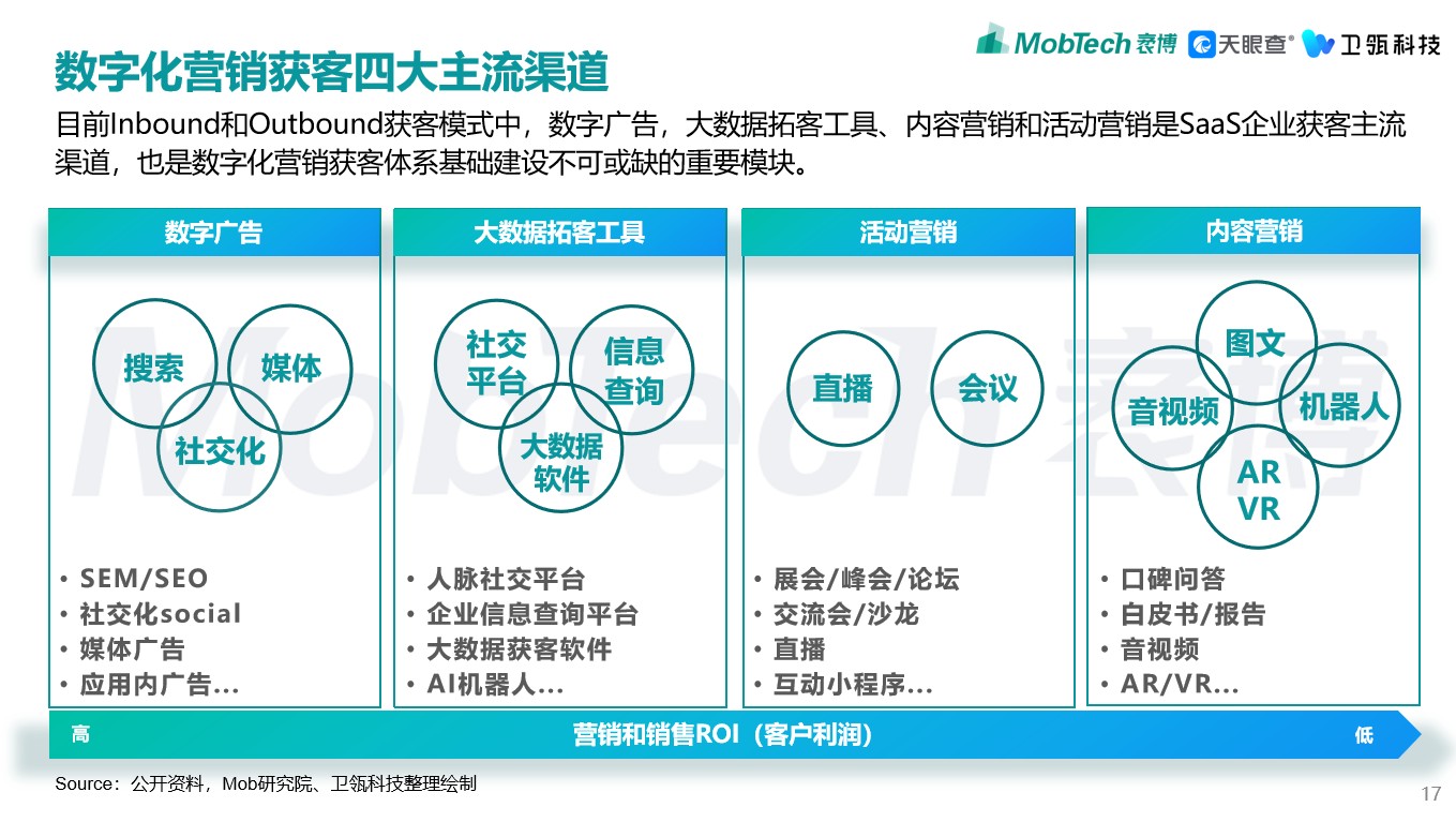 竞争市场,SaaS企业获客需要有效的营销策略。在当今的数字化营销环境中,SaaS企业开始逐步采用将集客营销策略(Inbound Marketing)和重定向推式营销策略(Outbound Marketing)相结合的获客方式。其中,数字广告,内容营销、活动营销和大数据拓客工具是SaaS企业获客主流渠道,也是数字化营销获客体系基础建设不可或缺的重要模块。