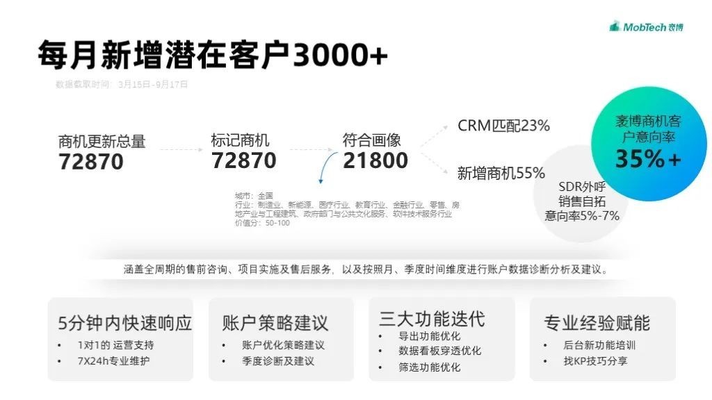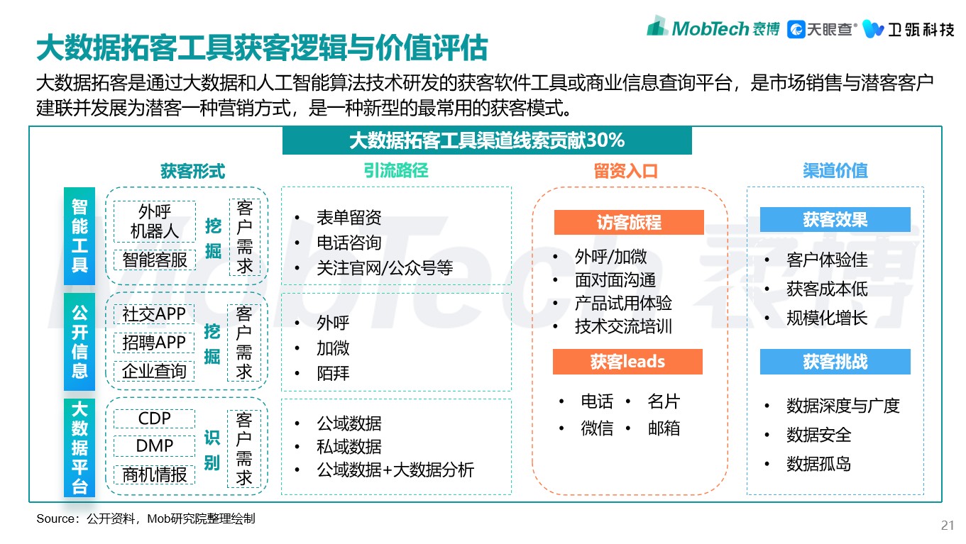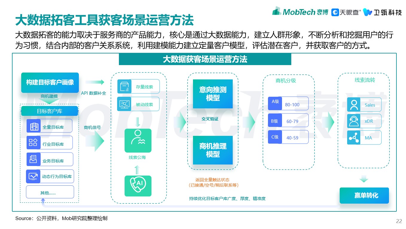 以MobTech袤博科技旗下袤博商机管理平台为代表的大数据拓客工具,通过大数据能力,建立人群形象,不断分析和挖掘用户的行为习惯,结合内部的客户关系系统,利用建模能力建立定量客户模型,评估潜在客户,并获取客户的方式。