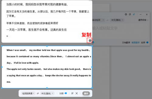 比如文字翻译功能,只需将翻译的内容粘贴到文本框中,系统便会自动检测并进行翻译,最后点击【复制】就能将翻译结果导出了。