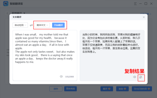 软件会自动检测语言,我们只需设置转换后的语言,并点击【开始翻译】就可以快速得到翻译结果了,最后点击【复制】就能将翻译结果导出。