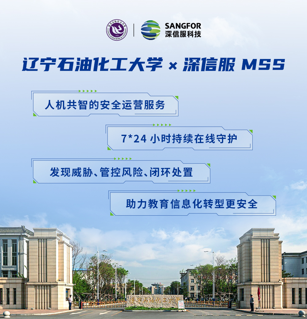 基于以上问题,辽宁石油化工大学迫切需要一个可视、可控、可管的安全运营体系以保障校园网络安全有序运行。经过反复探索和调研,辽宁石油化工大学最终引入了深信服安全托管服务MSS,以 “7*24小时全天候精准检测通告”、“人机共智有效识别、预防风险”、“主动可视化闭环运营”三大服务能力,结合下一代防火墙AF、终端安全管理系统EDR、安全感知管理平台SIP、威胁检测探针STA帮助辽宁石油化工大学成功建立了一套“云网端”一体化的安全运营体系。