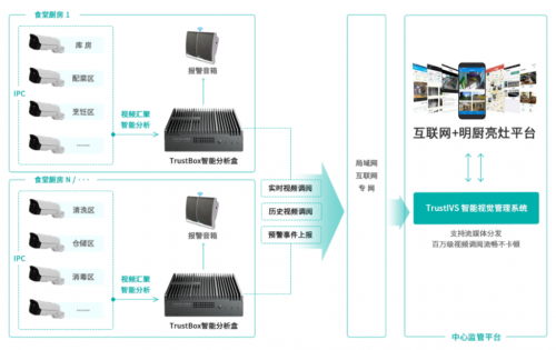 前端监控设备收集数据,边缘计算单元TrustBox处理数据,可视化智能管理平台分析数据,由此构成了亚略特“互联网+明厨亮灶”解决方案。