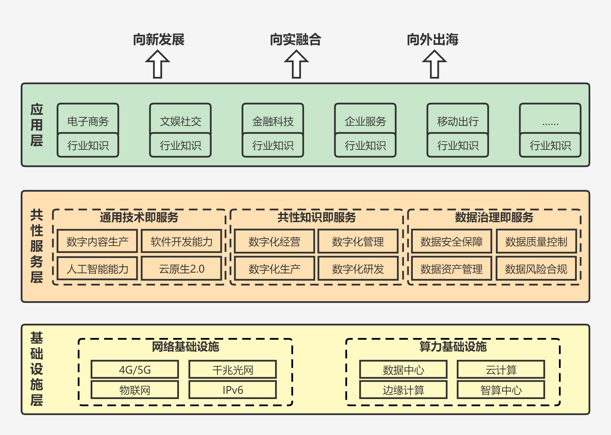 随着互联网应用不断丰富,以及用户需求与产品供给之间频繁互动反馈,以数字内容、软件开发能力、AI能力、数据治理为代表的共性技术,通过技术服务构成数字能力,以应对更复杂的技术需求。而企业的这类需求得以被标准化、规模化和基础设施化部署技术能力满足,从而降低了互联网创新发展的门槛。