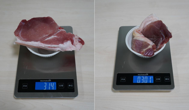 蔬菜保鲜效果优秀,这款冰箱对肉类食材的储鲜也相当优秀,类似的,我们将两份重量相近的猪肉分别放在WILL生鲜空间和常温环境,经过3天的静置,生鲜空间中的猪肉重量从312g略微下降至307g,其表面依然呈现鲜红色彩,肉质柔软弹性十足,同时完全没有腐臭味道产生,保存得相当完好。