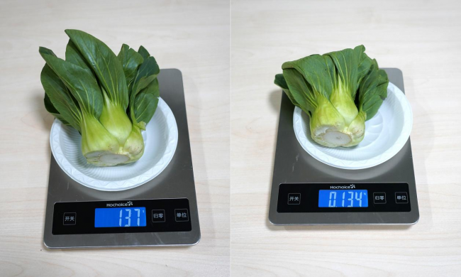 随后我们针对冰箱控制失水率的效果进行了测试,过程比较简单,我们选取两份重量相近的青菜,分别放在冰箱蔬果鲜储区和常温环境中,经过3天的静置,可以看到冰箱蔬果鲜储区的青菜重量从137g略微下降至134g,外观与色泽基本保持翠绿的状态,触摸时能够感受到饱满的汁液感。