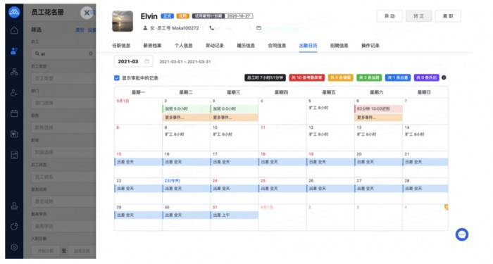 Moka People假期管理可以自定义不同的考勤、发假和加班规则,月底自动汇总每个员工的出勤情况,自动实时计算考勤日报、月报,并同步进行薪酬核算,不管多混乱、多随机的假勤安排,HR都可以心平气和轻松应对!
