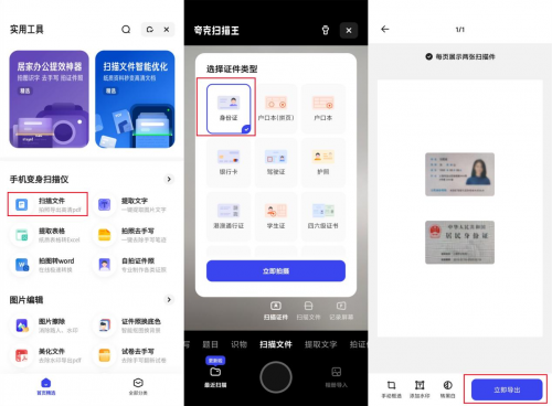 它提供了身份证复印件、图片转文字、图片转PDF等功能,其中的身份证复印机就可以帮我们扫描证件照并生成电子版。