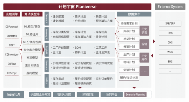 底层技术层面,基于自主研发的国产求解器COPT以及COMatrix、COForecast等一系列计算引擎,计划宇宙可以解决复杂消费场景中的大规模计算、数据处理、预测等问题。算法模型层面,计划宇宙结合丰富的应用实践构建了不同场景的算法模型,比如常规品预测模型、爆品预测模型、单仓库存补货模型、多级仓网补货模型等,用智能算法帮助企业梳理业务数据和逻辑。业务应用层面,根据不同行业不同场景的特点和需求,构建针对多类业务问题的应用功能模块,满足企业具体的业务运营需求。