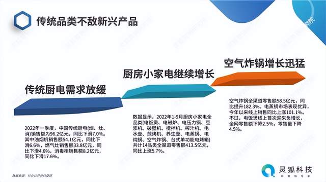 总体上看,厨电市场传统品类不敌新兴品类,在传统厨房电器销售额下滑的同时,厨房小家电销量持续增长,尤其空气炸锅增长迅猛。