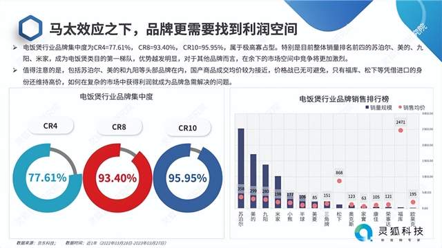 作为家庭厨房的“标配”,电饭煲经过多年的发展,保有量已近饱和,市场发展低迷。灵狐研究院的研究显示,电饭煲行业品牌集中度为CR4=77.61%,CR8=93.40%, CR10=95.95%,属于极高寡占型市场;国产商品成交均价较为接近,价格战已无可避免。从竞争态势看,电饭煲品牌应积极依托产品分层提高利润空间。