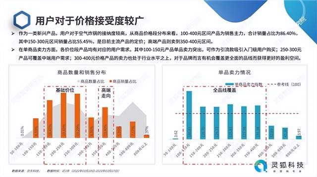 由于小巧易用、可用度高、保有量远未达到饱和,所以用户对于空气炸锅的接纳度较高。研究认为,100-400元皆为销售主力,其中100-150元产品单品卖力突出,可作为引流款吸引入门级用户购买;250-300元产品可覆盖中端用户需求;300-400元价格产品的卖力也处于行业水平之上,有更好的盈利空间。