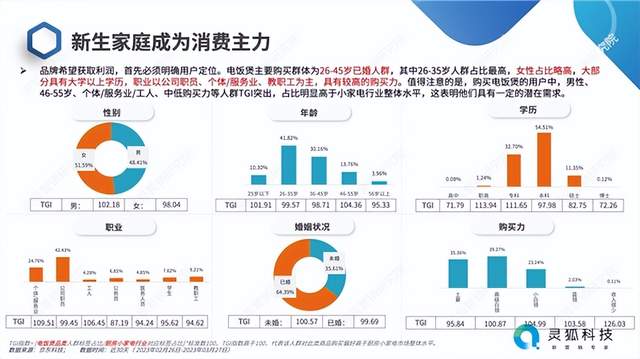从目标人群画像来看,电饭煲的消费主力以新生家庭为主,女性、大学以上学历占比较高;而年龄较大、购买力较低的男性群体则有一定的潜在购买需求。