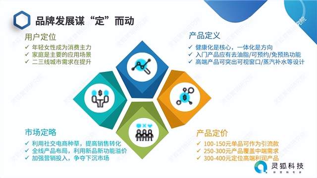 根据对电饭煲市场的洞察,灵狐研究院认为品牌在营销中主要从用户定位、产品定义、市场定略、产品定价四个方面,按照“依托产品分层,博取利润空间”来制定相应的策略。