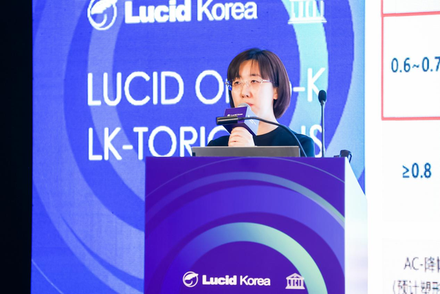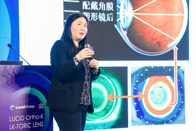 精彩致辞过后杨院长首先带来课题分享《露晰得差异化设计一近视控制效果与视觉质量的兼顾》,从塑形镜的控制效果和舒适度及良好视觉质量上不同的案例进行解析。从控制效果来看,露晰得更稳合东方人眼球,越戴越稳定;在所有验配品牌中若用MRT展示视网膜离焦状态,只有露晰得才能呈现非常理想的离焦状态;同时在验配过程中,不能把所有的产品趋于同性化,不能用一个标准去要求它的验配,露晰得Toric设计的镜片能够在不规则的角膜上获得较好的定位,因此对于视觉质量和稳定性都比较好。