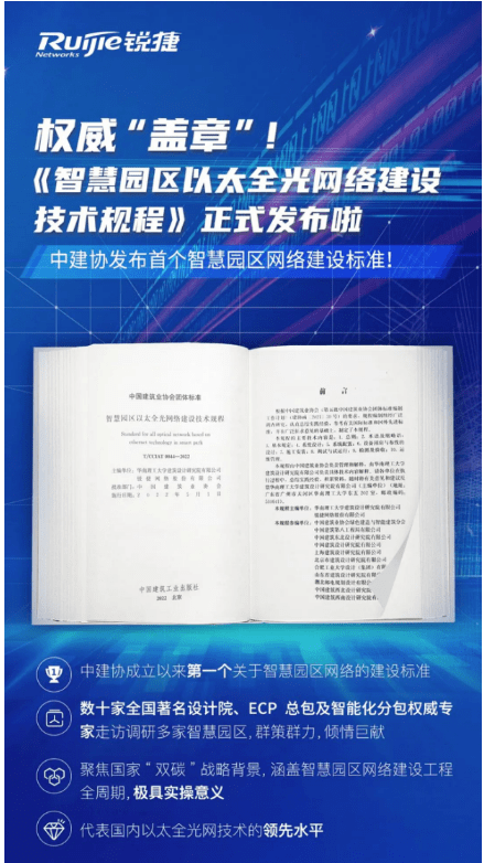 极简光方案已经服务超过1000名客户,从教育出发,不断向企业、医疗多个行业延伸。从推出1.0到焕新3.0,极简以太全光也收获了不少业界奖项,代表了行业内部对以太全光路线的认可。而在2022年3月,中国建筑业协会发布了首个智慧园区网络建设标准——《智慧园区以太全光网络建设技术规程》,代表国内以太全光网的领先水平,锐捷作为厂商代表参与了该新规程的主编工作。