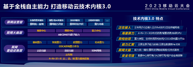 据了解,全新升级后的移动云以“智”“信”为内核,“算力、连接、定制、安全”为核心关键词,提出“算力网络”理念和“网络无所不达,算力无所不在,智能无所不及”的愿景,并重磅发布具有泛在接入、海量算力、异构协同、能力汇聚、算网大脑、安全可信六大特点的“技术内核3.0”,打造并落地新一代超级算网大脑;面向算力网络打造新型信息基础设施,全力打造一朵智能、智慧、安全可信可控的“云”。