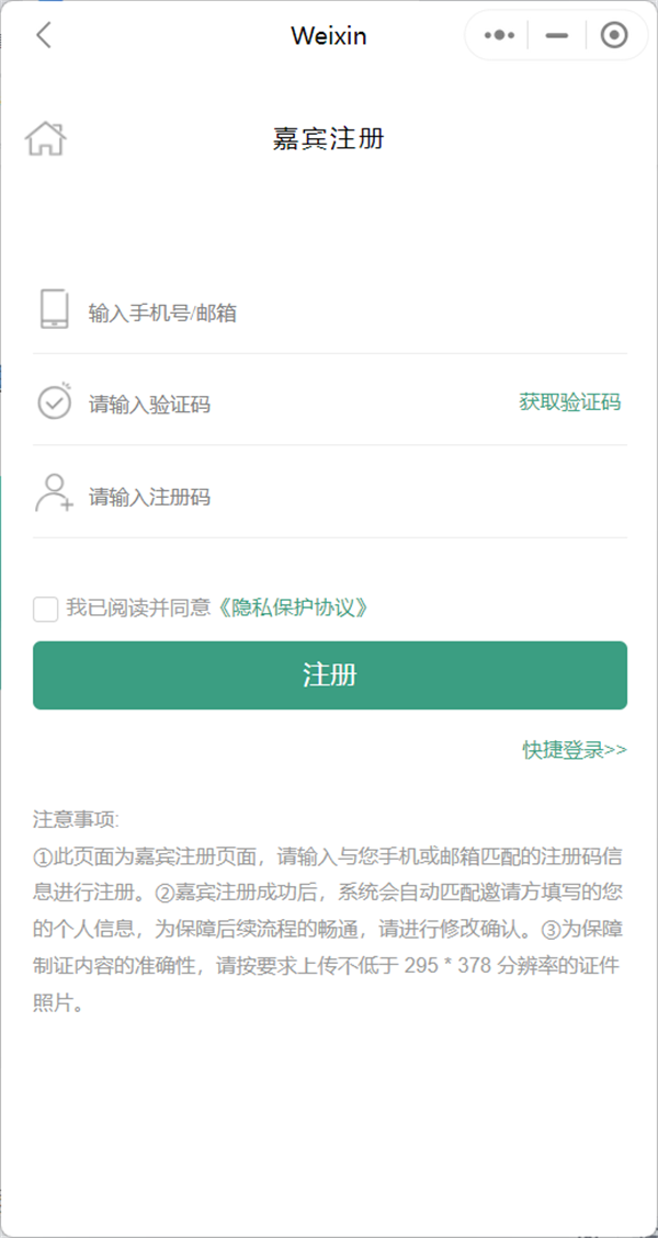 (2)嘉宾输入手机号/邮箱获取验证码,并输入注册码,点击“注册”进入用户中心,填写参会信息并提交。