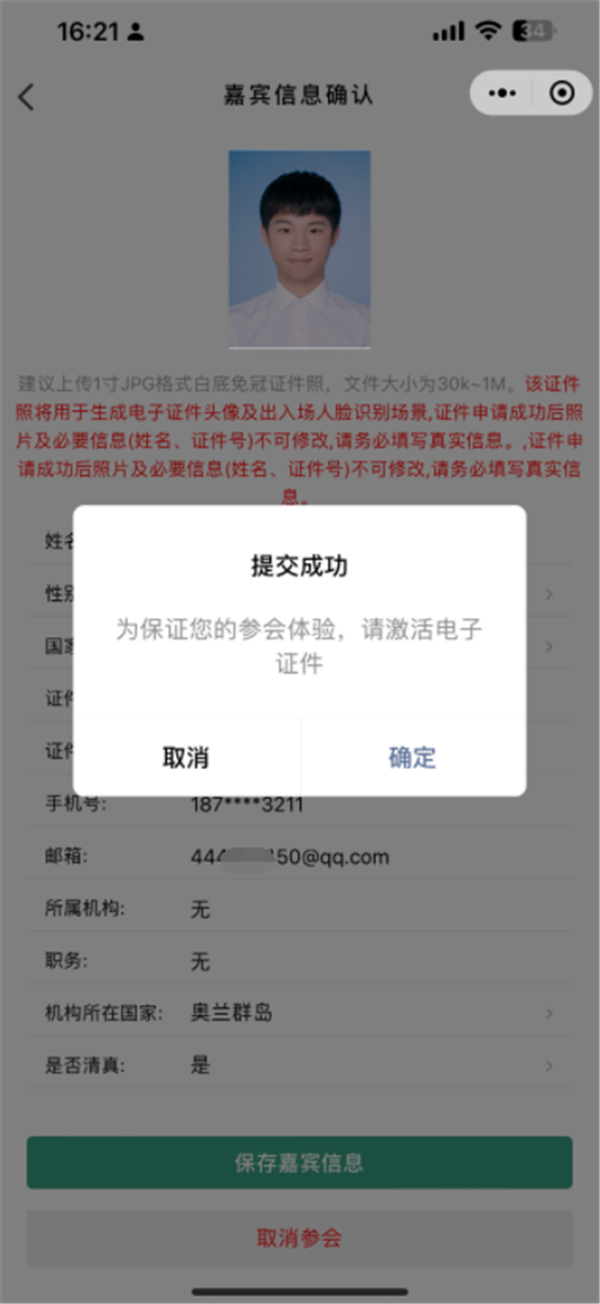(3)在提交参会信息时同步生成电子证件,嘉宾前往进行电子证件激活后,完成嘉宾注册。