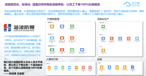 辽宁海浪防爆电器有限责任公司,特别强调设计流程的意义无论人员水平高低,都让员工下单达到一个最高的水准,这个功能让流程信息100%杜绝错误。海浪防爆的非标品调货申请,从调货到设计到生产、外协采购到发货,到开票和收入确认,需要各部门一起协作,而且产成品有3万多种,物料难确认。通过业协一体让项目准时率提升到95%,物料利用率提升50%,开票从1个月提升到24小时内收入确认。