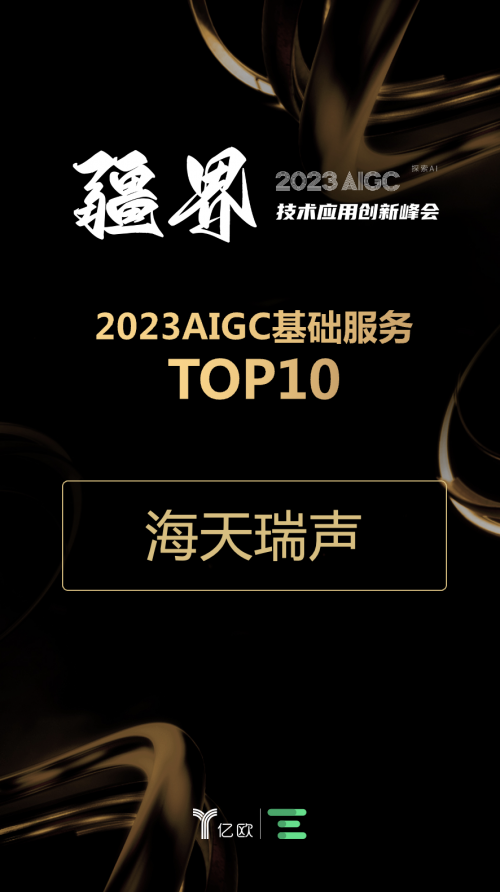 本次大会上还发布了「AIGC基础大模型Top 10、AIGC基础服务Top 10、AIGC应用Top 50」三大榜单,海天瑞声入选「AIGC基础服务Top 10」榜单。