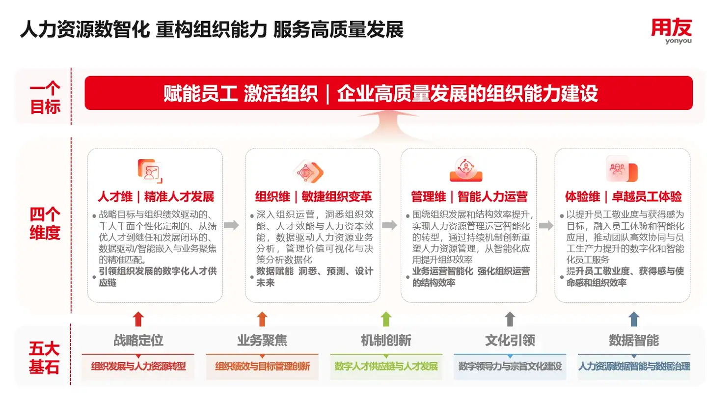 按照用友的模型,可以将人力资源数智化的能力拆分为四个维度。